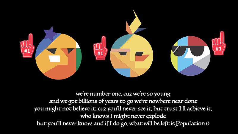 An excerpt from the illustration for "The Little Stars That Could", a song about a life of small Pop III star.